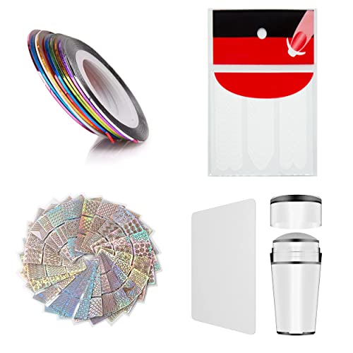 • Package Content: 10 Roll of self adhesive nail striping tape, 10 Sheets Of Manicure Tip Guide Nail Art Stickers Of Random Design, 24 Sheets of nail sticker(144 design), 1 nail stamp with 1 scraper.