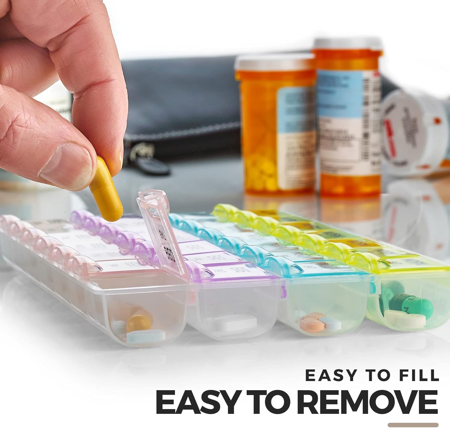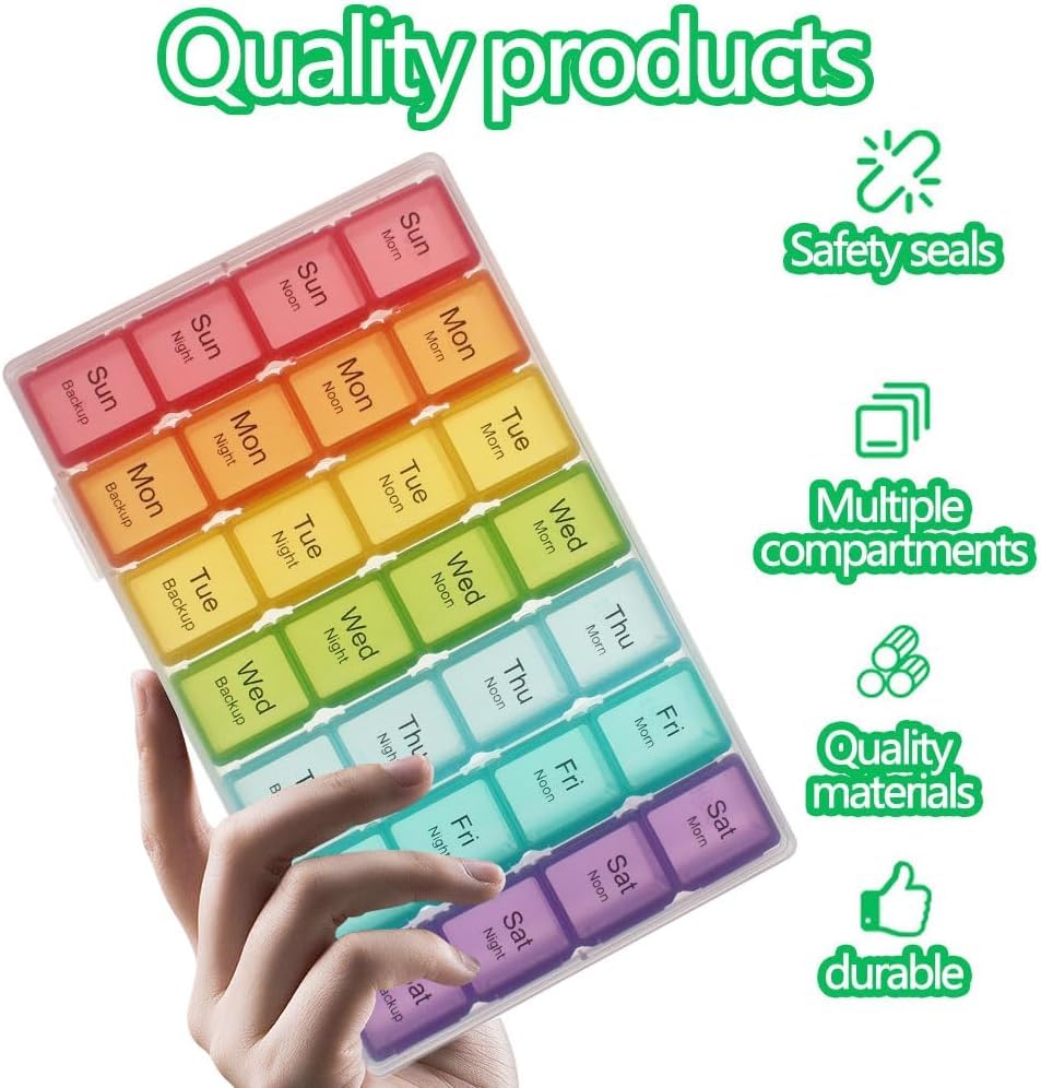 • ORGANIZATION: 28 compartments clearly labeled for morning, noon, night, and backup doses for each day of the week