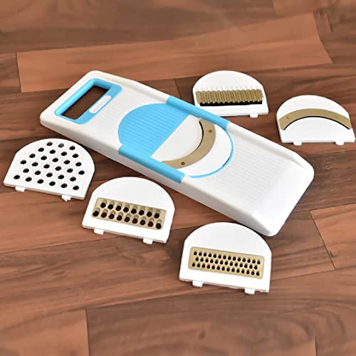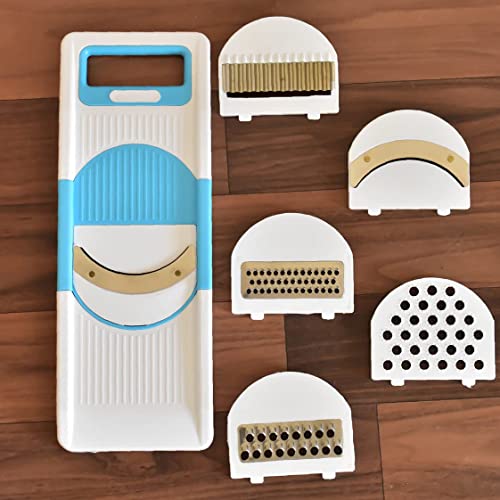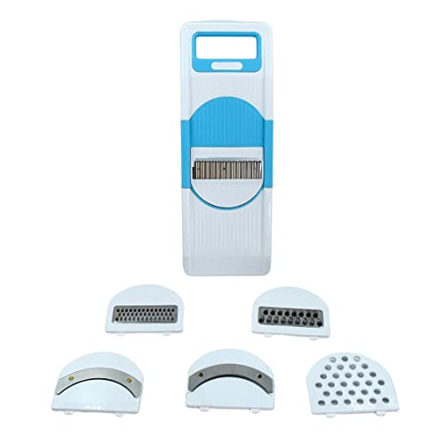 • FEATURES: Fruit and vegetable slicer with 6 different attachments for various shapes and size of slicing and cutting, can be used to cut the salad Slices lemons, potatoes onion and all kinds of fruits and vegetables