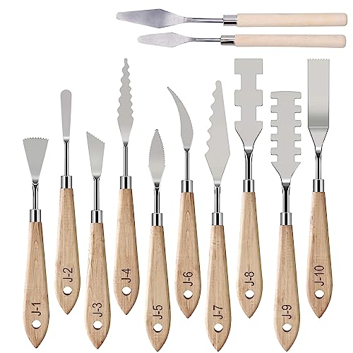 • Package Content:- 1 Knife of no. 1 to 10 + 2 extra small size premium quality stainless steel artist palette knife set with sturdy comfort-grip wooden handles. Our knives are made of stainless steel, which is easy to clean and not easy to be corroded and rusted. The handle is made of wood. It is ergonomic and feels good, making your painting more fluent.
